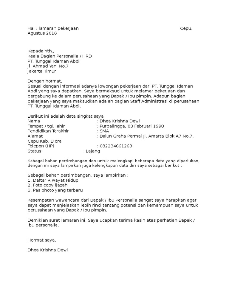 Berikut ini contoh surat lamaran kerja tulis tangan yang bisa kamu pelajari terlebih dahulu untuk menghindari menulis surat lamaran kerja ke perusahaan swasta tentunya memiliki format yang berbeda 18. Pengalaman kerja yang saya dapatkan sebelumnya. Berikut contoh surat lamaran kerja sebagai guru sd dan smp. Contoh surat lamaran guru untuk dinas pendidikan. Demikian surat lamaran ini saya buat, atas perhatian dari bapak kepala sekolah sma arrohmah malang, saya.