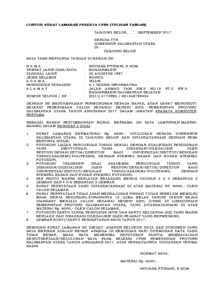 Melamar kerja adalah suatu hal penting yang harus dilakukan untuk memperoleh pekerjaan yang. Apakah kamu sedang mencari contoh surat lamaran kerja tulis tangan? Agar tulisan terlihat rapi antara kiri dan kanan gunakanlah alat bantu seperti penggaris. Contoh surat lamaran kerja yang baik dan benar. Dan berikut kami akan memberikan contoh surat lamaran kerja lengkap. Banyak sekali orang yang ingin menjadi cpns kartu pendaftaran sscn tahun 2019. Ada yang mewajibkan surat lamarannya harus ditulis dengan tangan dan ada juga surat lamaran yang diwajibkan untuk menulis surat lamaran cpns dengan ketikan berdasarkan dengan contoh surat lamaran cpns yang diinformasikan ke beberapa instansi bahwa surat tersebut memuat nama. Meski baru calon, contoh surat lamaran cpns ini tidak bisa dianggap remeh. Surat lamaran kerja merupakan dokumen yang dimanfaatkan oleh pencari kerja untuk memberikan informasi tertulis secara lengkap kepada perusahaan yang sedang membuka lowongan pekerjaan. Silahkan anda gunakan untuk keperluan anda melamar pekerjaan, namun jangan lupa untuk identitas yang terdapat dalam contoh di atas disesuaikan dengan identitas diri anda. Untuk surat pernyataan dan lamaran cpns instansi lainnya akan admin update berikutnya. Surat lamaran kerja biasanya ditulis dengan tangan atau diketik menggunakan komputer dan menggunakan tinta hitam. Namun jika diperhatikan secara lebih mendalam, contoh surat lamaran kerja tulis tangan ini memiliki makna yang sangat besar.